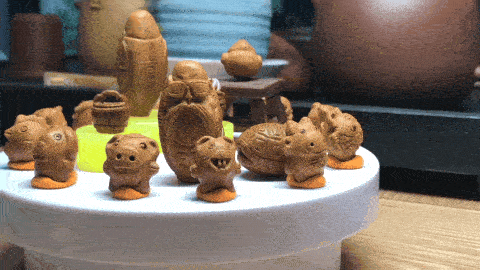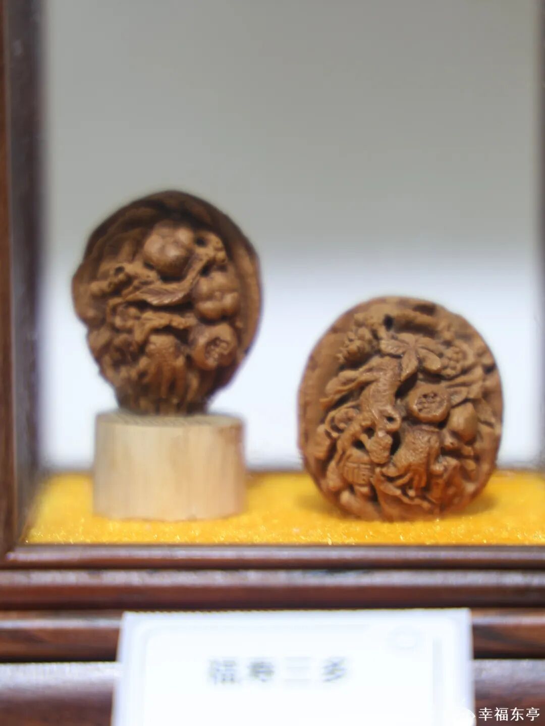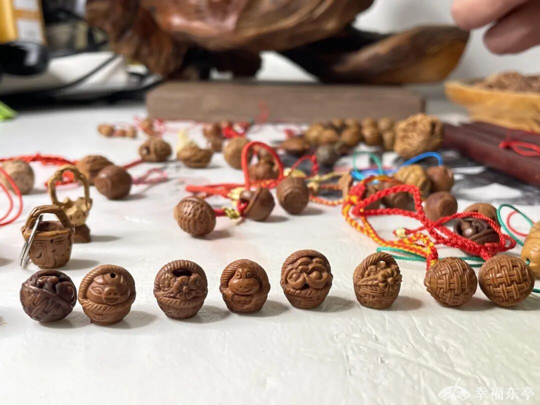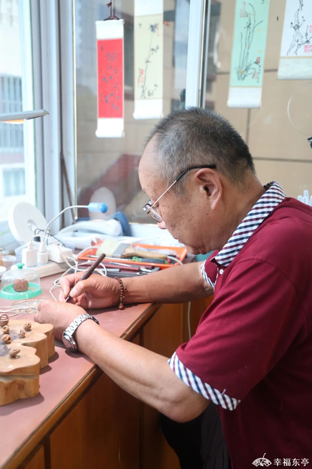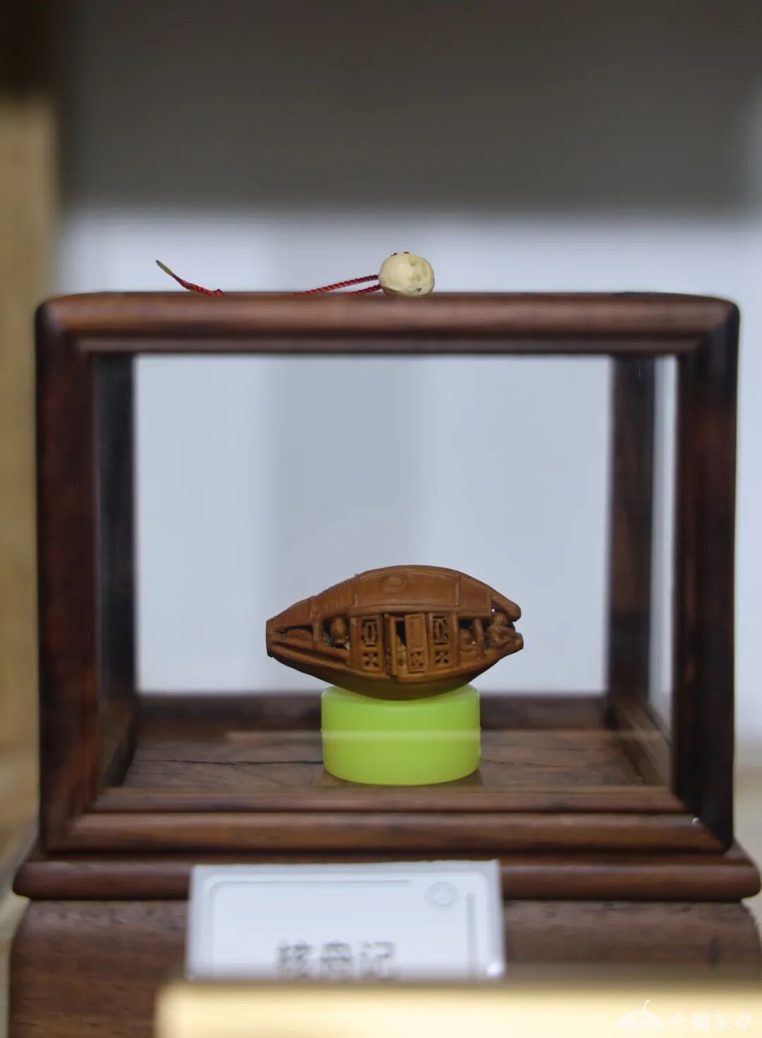 工作室中陈列的核雕作品琳琅满目,橄榄核上舟楫往来,桃核中亭台错落,杏核里人物栩栩,在这毫厘之间的艺术世界里,每一件作品都在诉说着匠人的巧思与坚守。